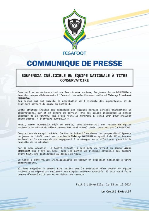 Par la même occasion, le Comité Exécutif a pris acte du retrait du joueur Aaron Boupendza qui s’est lui-même fermé les portes de l’équipe nationale qui demeure avant tout, une institution au-dessus de tous. Le Comex a donc validé l’inéligibilité du joueur en sélection nationale à titre conservatoire.