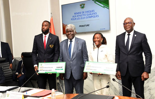 Les athlètes qualifiés à ce jour, ont donc reçu leurs chèques en présence du Premier Ministre, Ministre des sports et du cadre de vie. Qui leur a prodigué de sages conseils. « Restez concentrés sur vos objectifs. Respectez vos adversaires. L’humilité doit conduire vos actions. Soyez rigoureux. Et ayez foi en vous et dans le soutien des Ivoiriens. Ils attendent que vous portiez très haut le drapeau », a indiqué M. Robert Beugré Mambé.