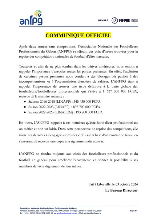L’Association Nationale des Footballeurs Professionnels du Gabon a émis un communiqué concernant la reprise du championnat. Bien que le bureau de l’ANFPG se déclare satisfait de cette reprise, il souligne néanmoins l’importance pour les footballeurs de disposer d’un contrat en bonne et due forme.