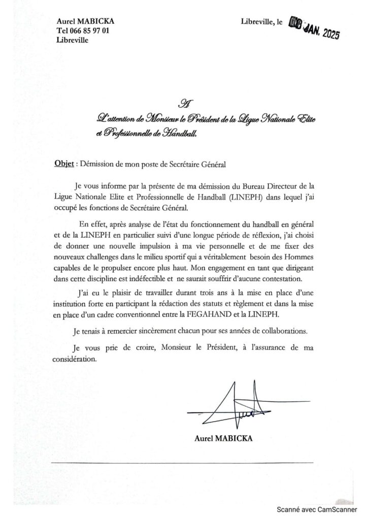 Aurel Mabicka, Secrétaire Général de la Ligue Nationale d’Élite Professionnelle d’Handball (Lineph), a officiellement annoncé sa démission la fonction de Secrétaire Général,