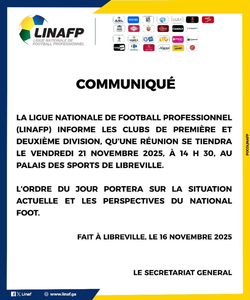C’est dans un communiqué parvenu à notre rédaction que nous apprenons que la Ligue Nationale de Football Professionnel tiendra une importante réunion au Palais des sports de Libreville, à Petit Paris. L’ordre du jour portera sur la situation actuelle du championnat et les perspectives du National Foot.