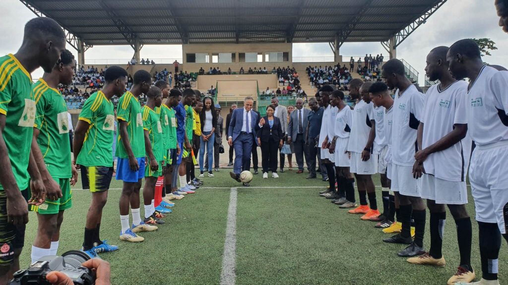Le Championnat scolaire et Universitaire reprend du service. Le ministre des sports Franck Nguéma et Géraldine Robert, responsable du CSU ont discuté des tenants et des aboutissants de cette saison 2022 – 2023 qui va durer deux mois et dont le lancement hier a eu lieu à l’ancien stade de la poste, l’actuel ruban vert, par un match de football.