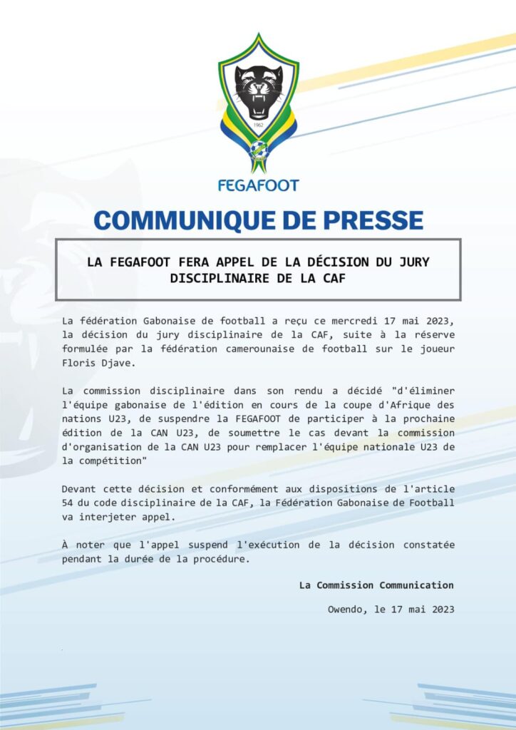 L’appel fait par la Fédération Gabonaise de Football suite à la décision du jury disciplinaire de la CAF suspend automatiquement cette disqualification du Gabon le temps de l’examen du recours déposé par la Fegafoot. Il y a donc de quoi croire en la participation du Gabon à la prochaine Coupe d’Afrique des Nations des moins de 23 ans.