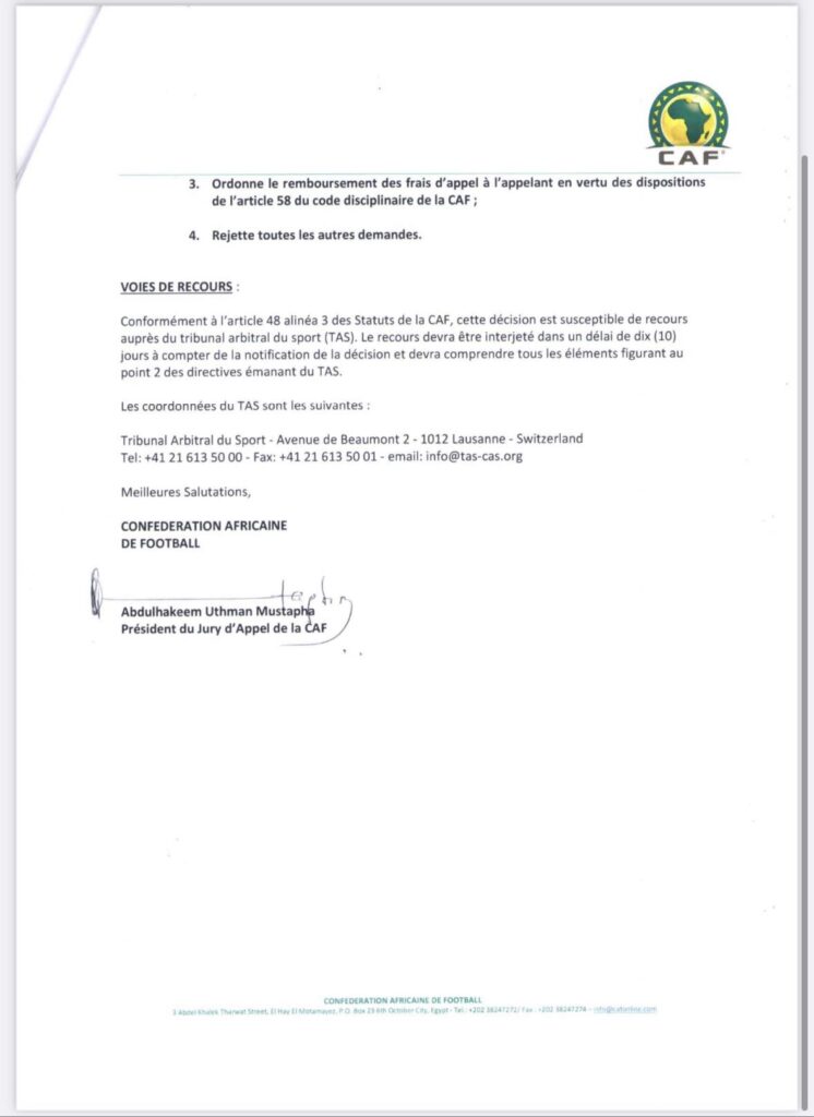 Par conséquent, il « annule, en toutes ses dispositions, la ‘’DECISION 006 – ALG — 10.05.2023’’ rendu par le Jury Disciplinaire de la CAF et par conséquence la décision de la Commission d’Organisation du 27 mai 2023 » et « rejette toutes les autres demandes », a indiqué l’instance.