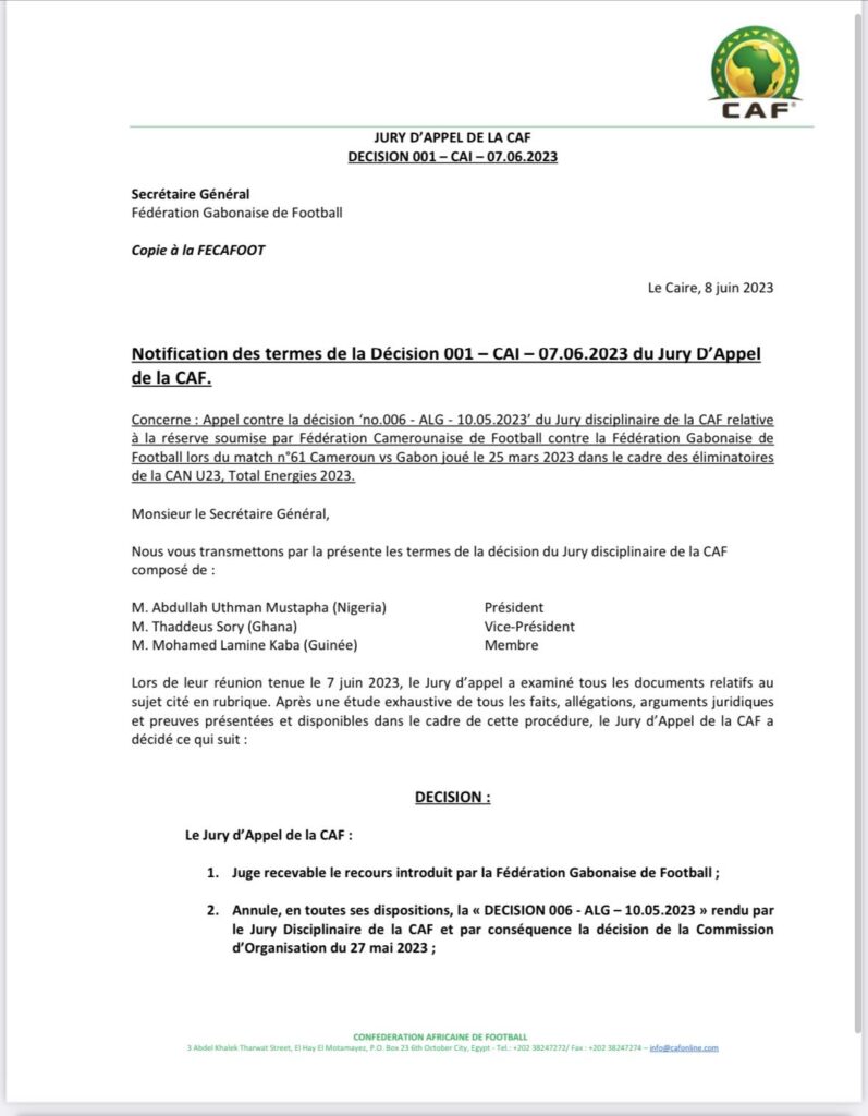 « Lors de sa réunion tenue le 7 juin 2023, le Jury d’appel a examiné tous les documents relatifs au sujet cité en rubrique. Après une étude exhaustive de tous les faits, allégations, arguments juridiques et preuves présentées et disponibles dans le cadre de cette procédure, le Jury d’Appel de la CAF (…) juge recevable le recours introduit par la Fédération Gabonaise de Football », peut-on lire dans le communiqué de la CAF en date du 8 juin 2023.