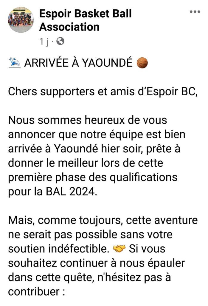 Espoir BC se trouve actuellement au Cameroun pour y jouer la première phase de la Basketball Africa League.Cependant, sur le plan financier, la formation de Libreville souffrirait énormément et, a encore fait appel aux bonnes volontés.